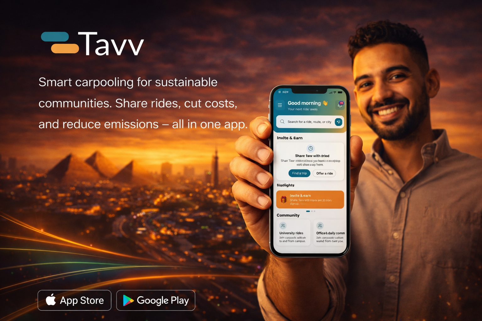 TAVV is your everyday companion — share rides and save money with Tavv Carpooling, or get your favorite meals delivered with Tavv Eats.